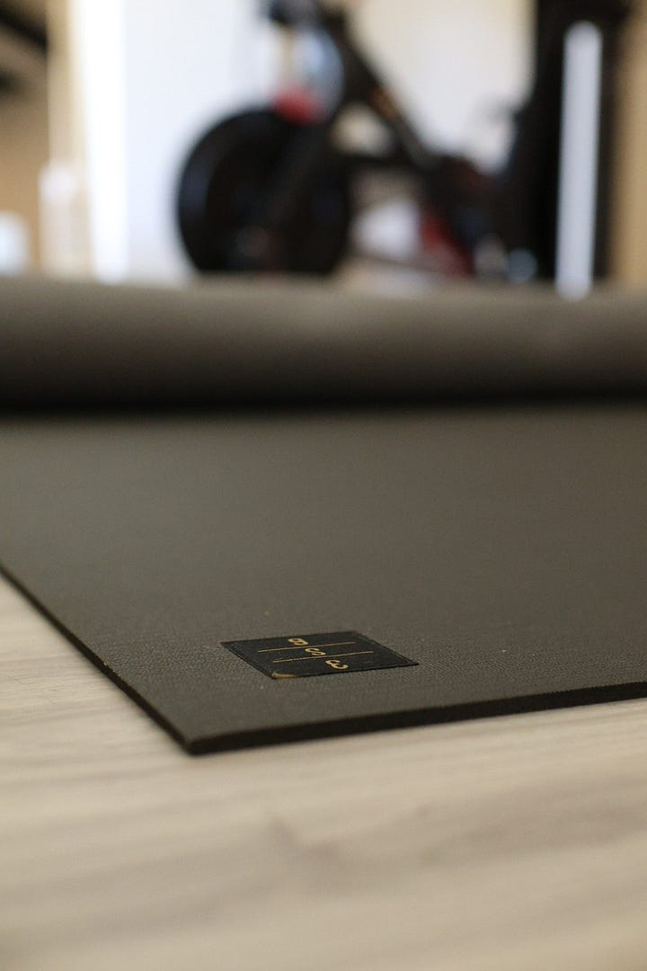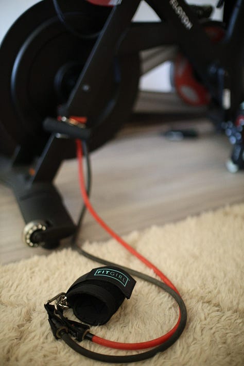 Instead of a cable machine, I purchased ankle straps made for a cable machine. These are a little S&Mish, but they add so much more variety. I connect them to two weighted bands that I wrapped around my Peloton. I use my bench from a distance and can get a full, straight-leg kickback, just as if I were at the gym. It’s brilliant and also my favorite new move.