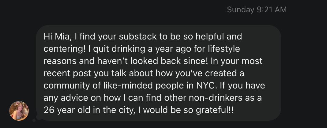 Hi Mia, I find your Substack to be so helpful and centering! I quit drinking a year ago for lifestyle reasons and haven’t looked back since! In your most recent post you talk about how you’ve created a community of like-minded people in NYC. If you have any advice on how I can find other non-drinkers as a 26 year old in the city, I would be so grateful!!